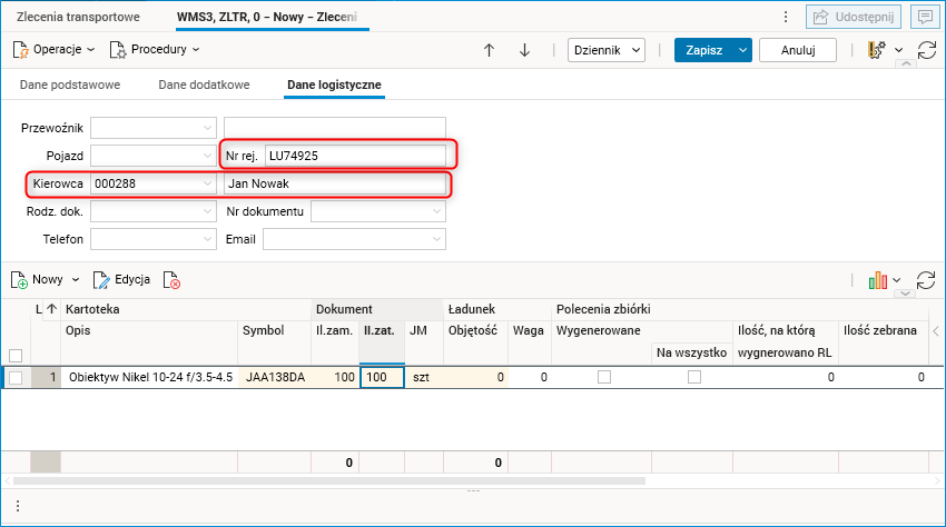 Wybranie na dokumencie ZLTR (zlecenie transportowe) trasy ze zdefiniowanym kierowcą oraz numerem rejestracyjnym spowoduje automatyczne uzupełnienie tych danych w nagłówku dokumentu.