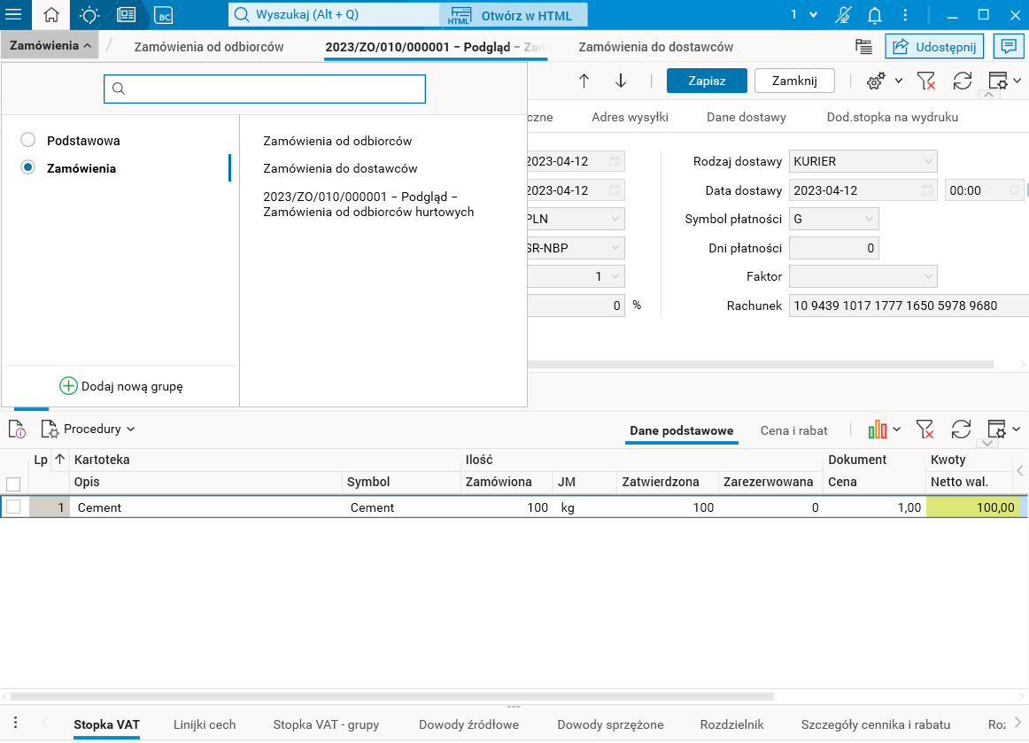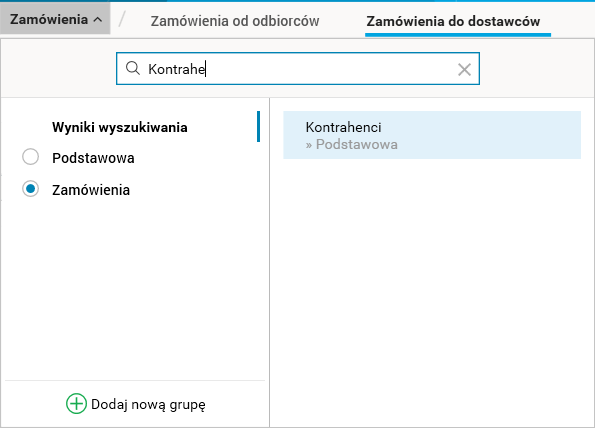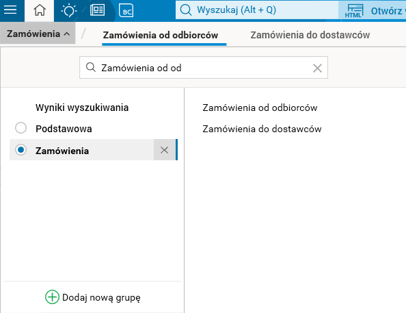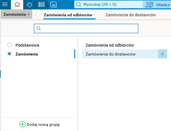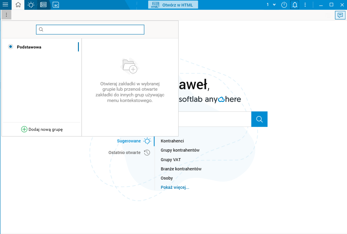 Aktywowanie grupy zakładek sprawia, że w obszarze zakładek wyświetlane są tylko zakładki przypisane do wybranej grupy. Zmiana grupy jest zablokowana podczas edycji oraz wykonywania operacji w zakładce należącej do grupy.