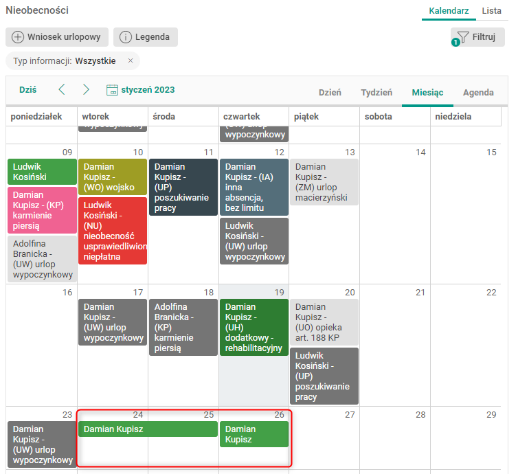Rys. Widok Kalendarz na pulpicie Nieobecności zespołu, ukryte dane wrażliwe dotyczące zasiłków