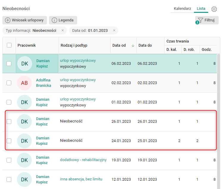 Rys. Widok Lista na pulpicie Nieobecności zespołu, ukryte dane wrażliwe dotyczące zasiłków