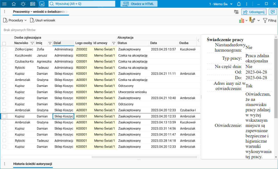 W szczególe Historia ścieżki autoryzacji prezentowany jest dotychczasowy obieg wniosku o świadczenie pracy podzielony na statusy, wraz z dokładną informacją o dacie, godzinie i osobie akceptującej wniosek, a także komentarze umieszczone na poszczególnych etapach zmian statusów wniosku.