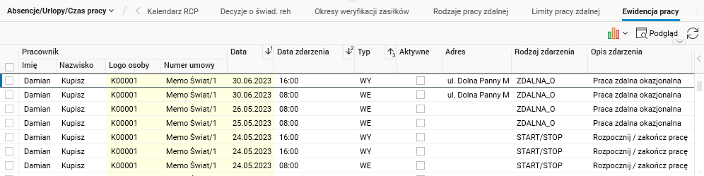 • data, godzina oraz typa zdarzenia (WE/WY, oznaczające odpowiednio Wejście/Wyjście); jeżeli praca zdalna zostanie zarejestrowana za pomocą akcji Zarejestruj pracę, w ewidencji zdarzenie to domyślnie zapisze się z godziną 0:00;
