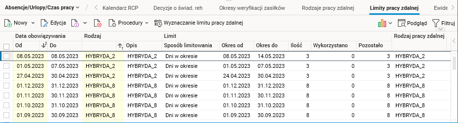 Rys. Słownik Pracownicy, szczegół Limity pracy zdalnej
