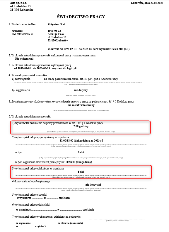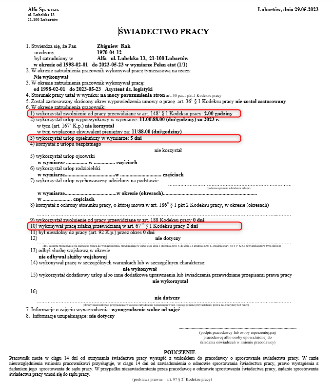 - pkt. 1 – informacje o liczbie dni lub godzin zwolnienia od pracy przewidzianego w art. 1481 § 1 Kodeksu pracy, czyli zwolnienie z powodu siły wyższej, wykorzystanych w roku kalendarzowym, w którym ustał stosunek pracy (wymiar 2 dni lub 16 godzin/rok);