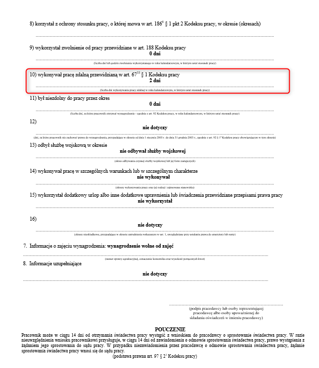 - pkt. 10 – informacje o liczbie dni wykonywania pracy zdalnej przewidzianej w art. 6733 § 1 Kodeksu pracy, czyli okazjonalnej pracy zdalnej, wykonywanej w roku kalendarzowym, w którym ustał stosunek pracy (wymiar 24 dni/rok).