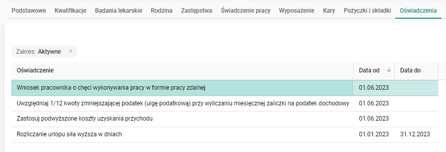 Użytkownik, który złożył oświadczenie, otrzyma powiadomienie o zaakceptowaniu go przez dział kadr. W Portalu HR, na pulpicie Moje dane, w zakładce Oświadczenia, pojawi się także wpis zawierający informacje o złożonym oświadczeniu oraz okresie jego obowiązywania.
