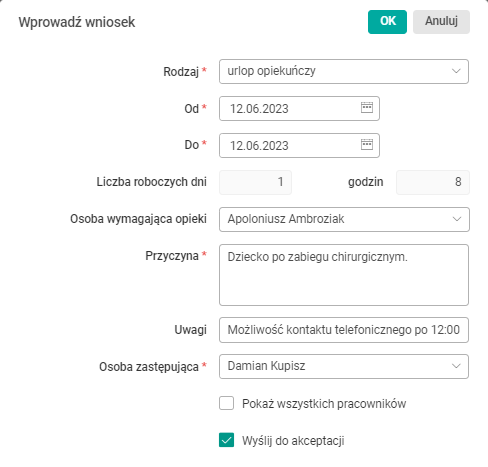 We wniosku należy również wskazać osobę zastępującą (z listy rozwijanej w polu Osoba zastępująca). Po wybraniu jej wniosek można wysłać do akceptacji lub zapisać bez wysyłania.