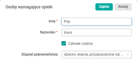 Jeżeli dodawana osoba bliska jest członkiem rodziny, należy zarejestrować jej imię i nazwisko oraz określić stopień pokrewieństwa.