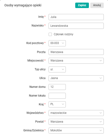 Rys. Formularz edycyjny Osoby wymagające opieki dla osoby niebędącej członkiem rodziny