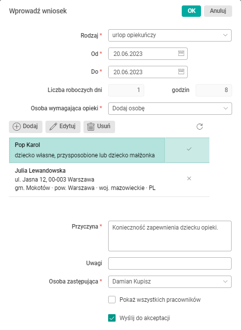 Rys. Formularz edycyjny wniosku o urlop opiekuńczy po wybraniu opcji Dodaj osobę