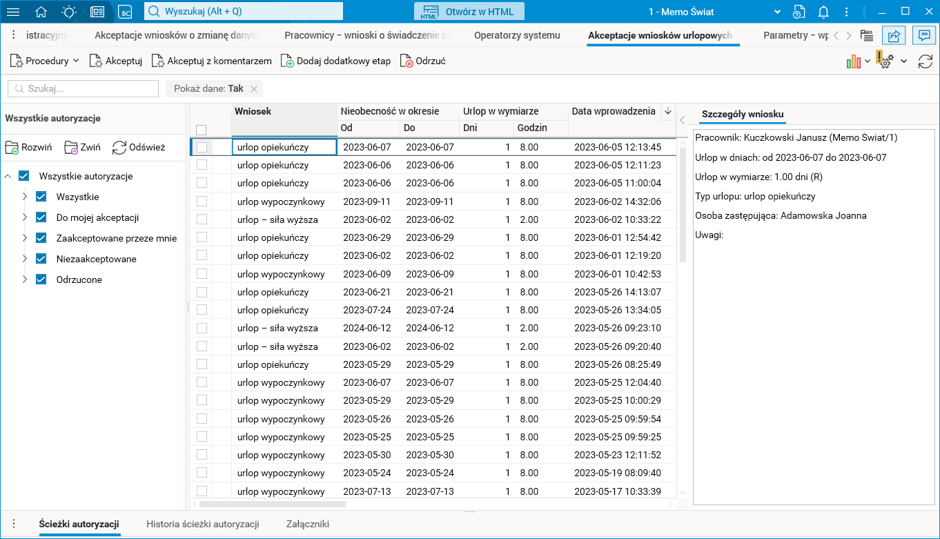 Po wysłaniu wniosku jest on kierowany do akceptacji pracownika kadr w systemie kadrowo-płacowym i trafia do słownika Akceptacje wniosków urlopowych. Akceptacja wniosku przez pracownika działu kadr sprawia, że jego status w portalu zostaje zmieniony na Zaakceptowany.