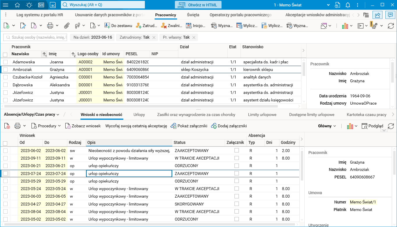 Rys. Słownik Pracownicy, szczegół Wnioski o nieobecność