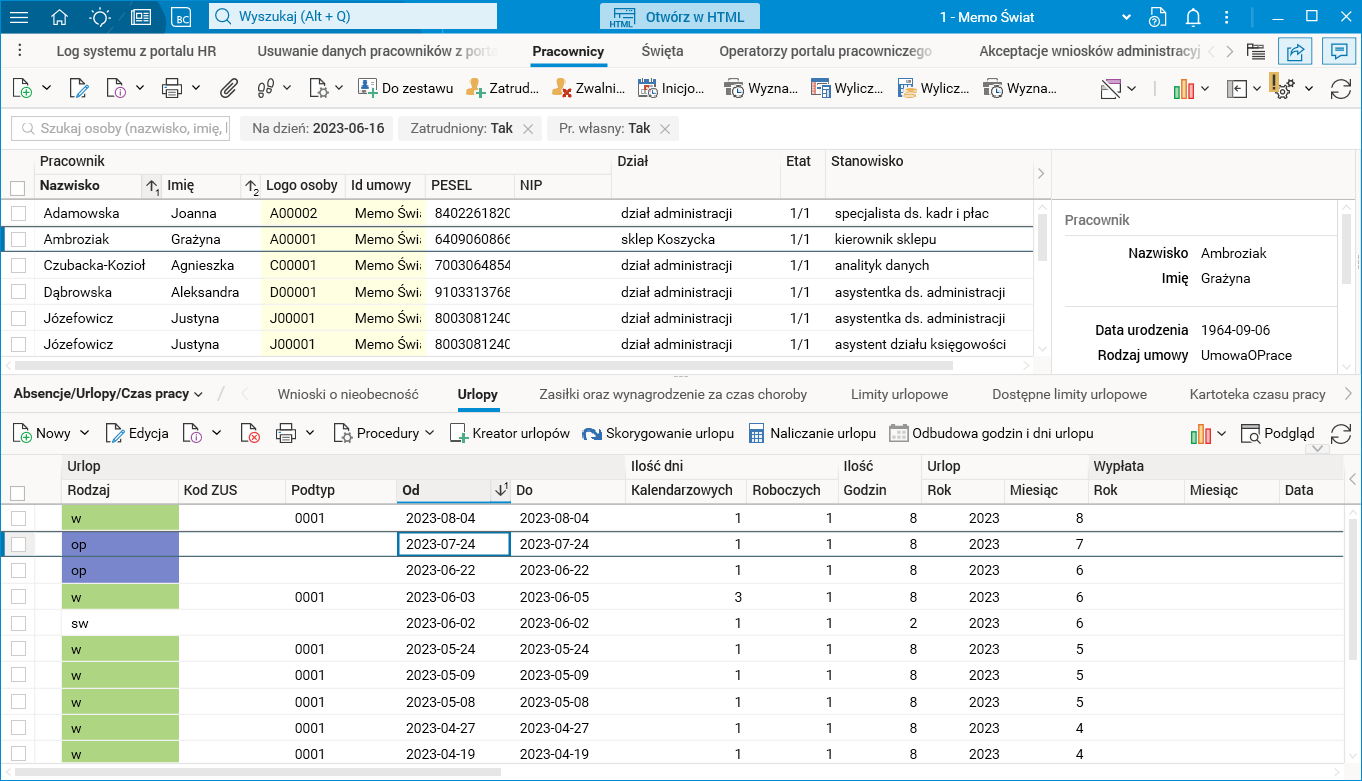 Zarejestrowane urlopy opiekuńcze wraz z informacjami dotyczącymi ich rozliczenia widoczne są także w szczególe Urlopy.