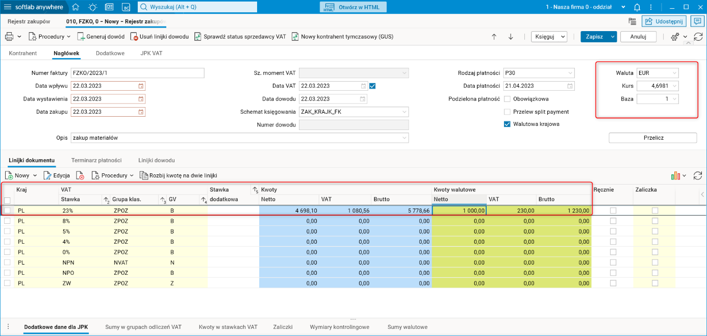 Rys. Słownik Rejestr zakupów, widoczne dwa kursy walut w nagłówku dokumentu – dokument VAT