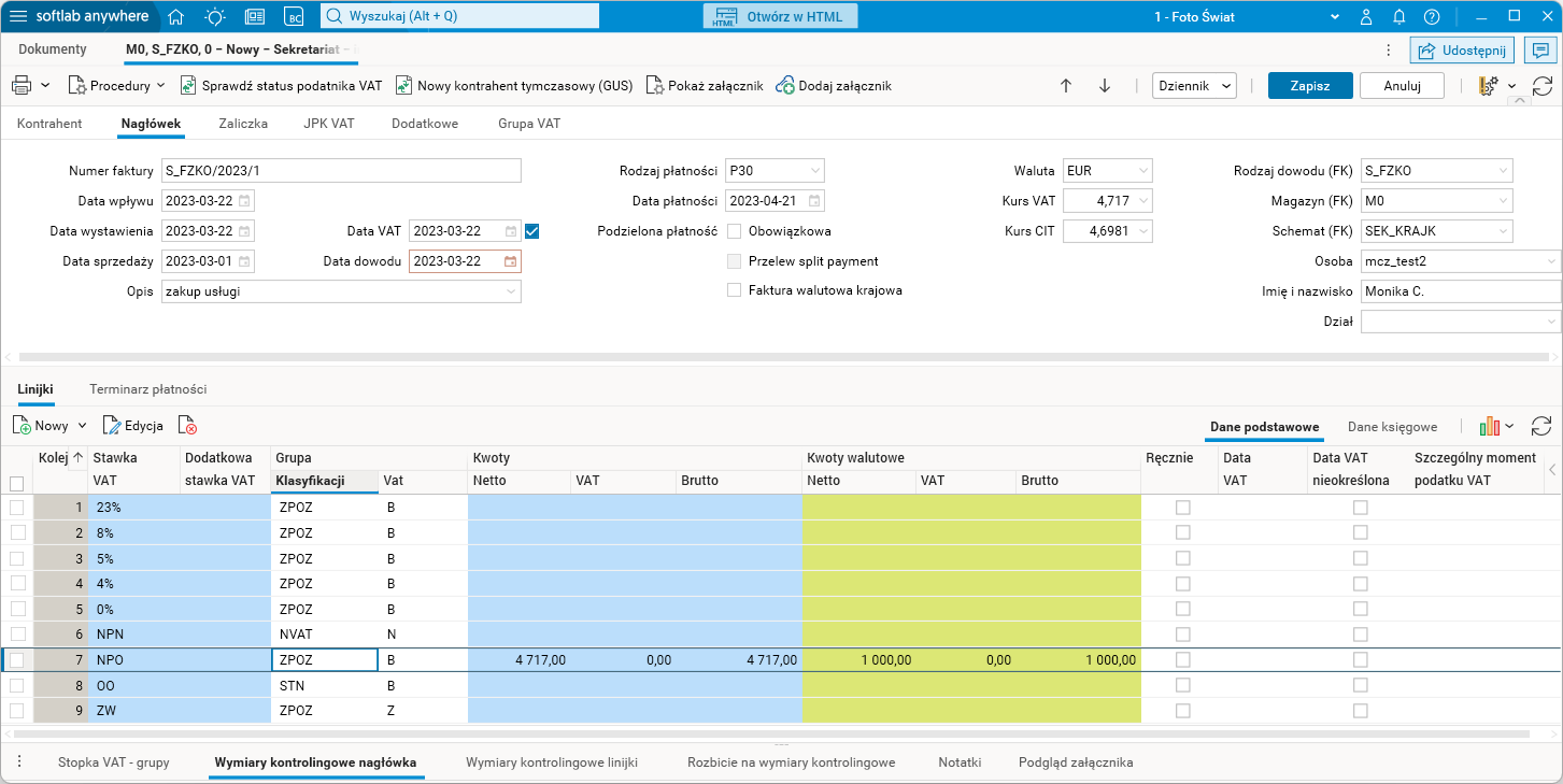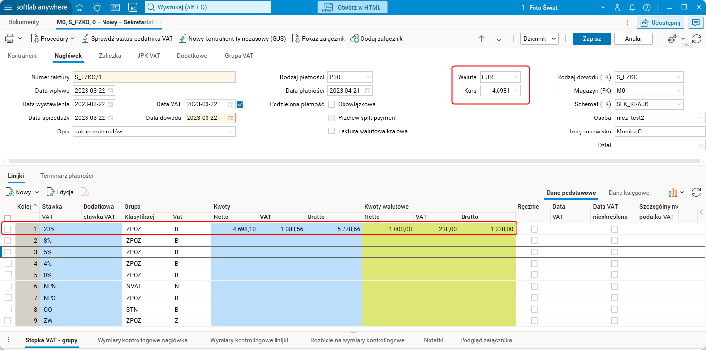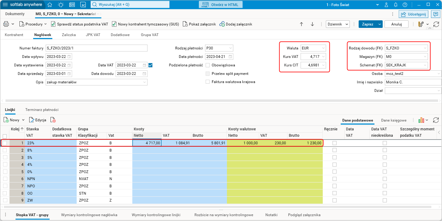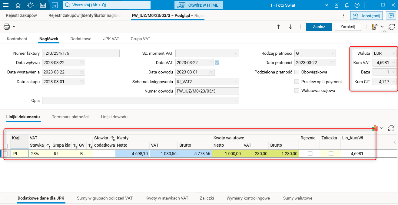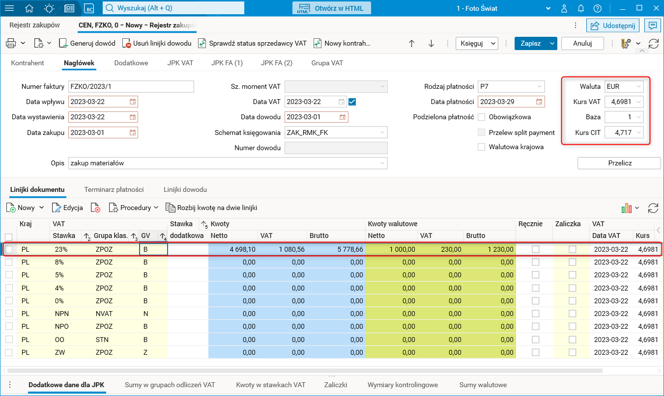 Gdy dokument VAT wystawiony w module Sekretariat (rodzaj dowodu S_FZKO) zostaje przeniesiony do modułu FK (rodzaj dowodu również S_FZKO, parametr Uwzględniaj na zestawieniach VAT standardowo jest włączony), to w nagłówku tego dokumentu pierwszym kursem będzie kurs VAT, a drugim kurs CIT. Kwoty netto, VAT oraz brutto w zakładce Linijki będą przeliczone po kursie VAT.
