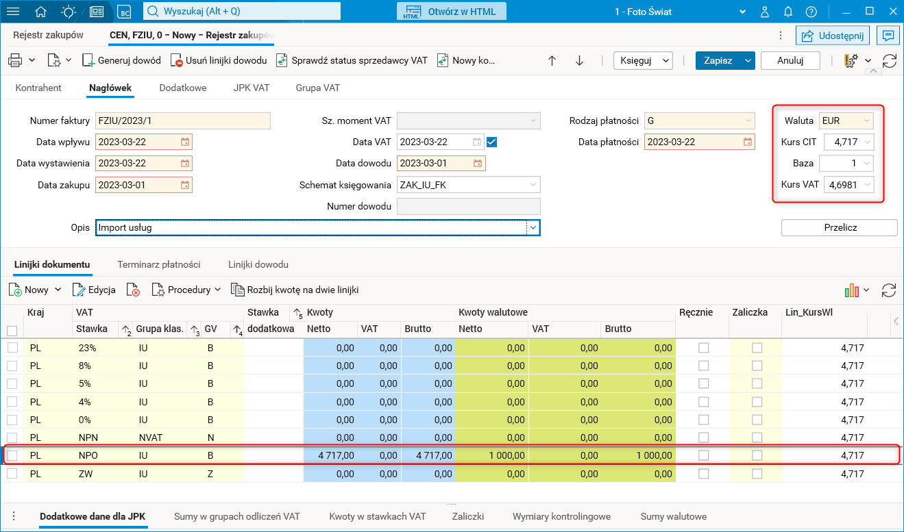 W przypadku dokumentu nieujmowanego w rejestrach VAT (wyłączony parametr Uwzględniaj na zestawieniach VAT dla rodzaju dowodu, np. FZIU) w nagłówku dokumentu pierwszym kursem będzie kurs CIT, a drugim kurs VAT. Kwoty netto, VAT oraz brutto w zakładce Linijki dokumentu będą przeliczone po kursie CIT.