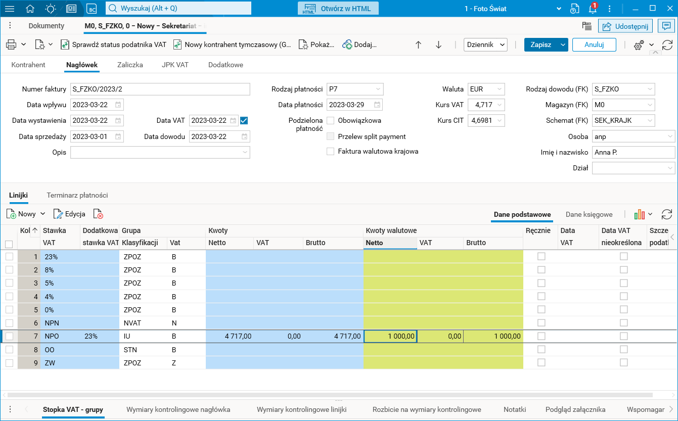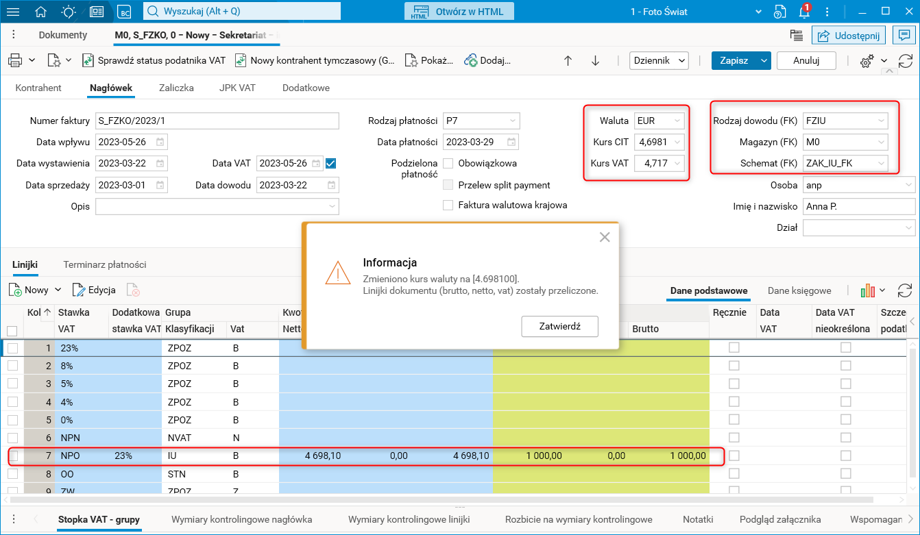 Gdy dokument nievatowski wystawiony w module Sekretariat (rodzaj dowodu S_FZKO) zostaje przeniesiony do modułu FK (rodzaj dowodu FZIU, parametr Uwzględniaj na zestawieniach VAT standardowo jest wyłączony), to w nagłówku dokumentu pierwszym kursem będzie kurs CIT, a drugim kurs VAT. Kwoty netto, VAT oraz brutto w zakładce Linijki będą przeliczone po kursie CIT.