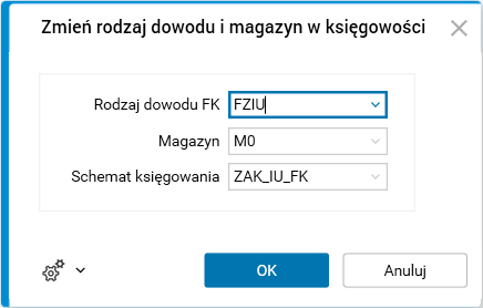 Po zapisaniu dokumentu, gdy dokument nie jest jeszcze przeniesiony do modułu FK, chcemy zmienić rodzaj dowodu w FK na dowód FZIU. Uruchamiamy procedurę Zmień rodzaj dowodu i magazyn w księgowości.