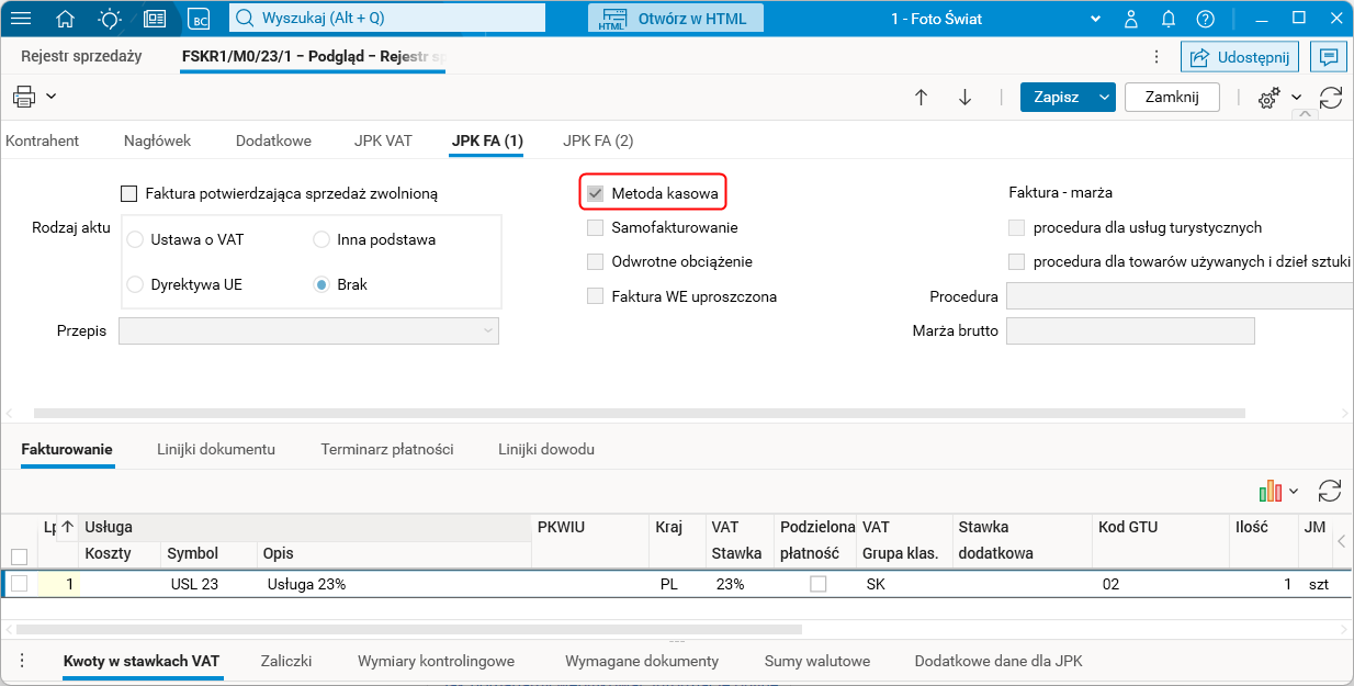 Rys. Znacznik Metoda kasowa w oknie edycyjnym faktury sprzedaży