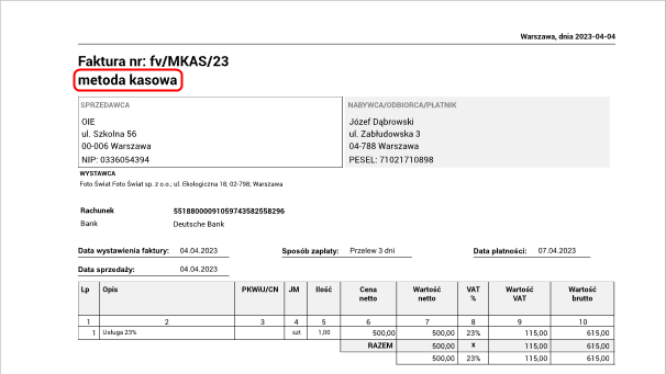Na wydruku faktury sprzedaży pod jej numerem wyświetlony jest dopisek metoda kasowa.
