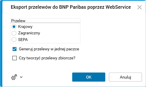 W parametrach procedury Eksport przelewów do BNP Paribas poprzez WebService w sekcji Przelew wybieramy typ przelewu: