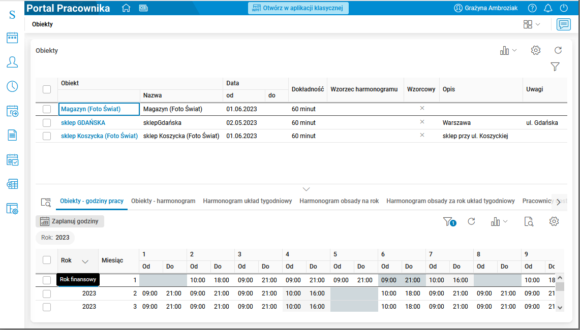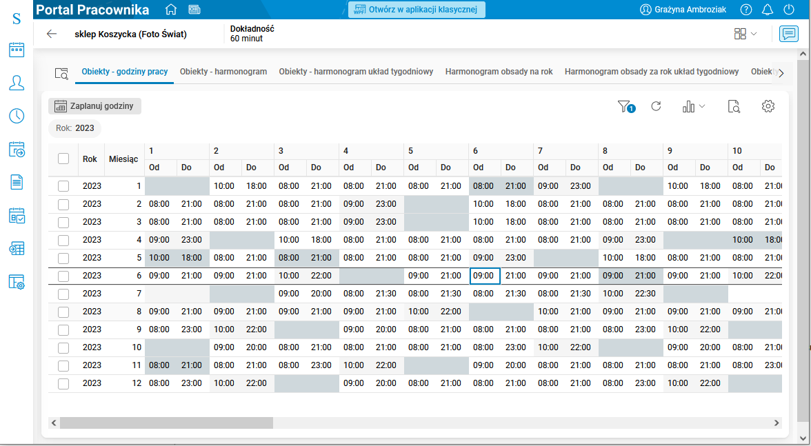 Szczegół prezentuje harmonogram obiektu na wybrany rok (domyślnie bieżący). W poszczególnych dniach wykazane są godziny jego otwarcia wraz z liczbą zaplanowanych etatów. Na przykład zapis 06:00 -22:00 (2) oznacza, że w danym dniu w obiekcie spodziewane jest, że w godzinach od 6 do 22 będę pracowały co najmniej dwie osoby.