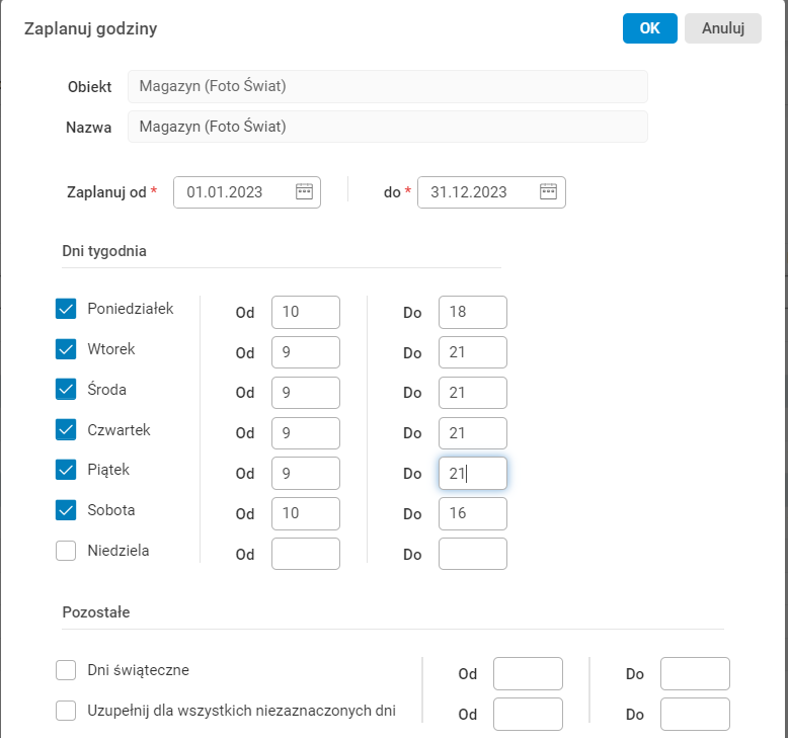 - sekcja Pozostałe – w tej sekcji można wskazać godziny otwarcia obiektu dla: