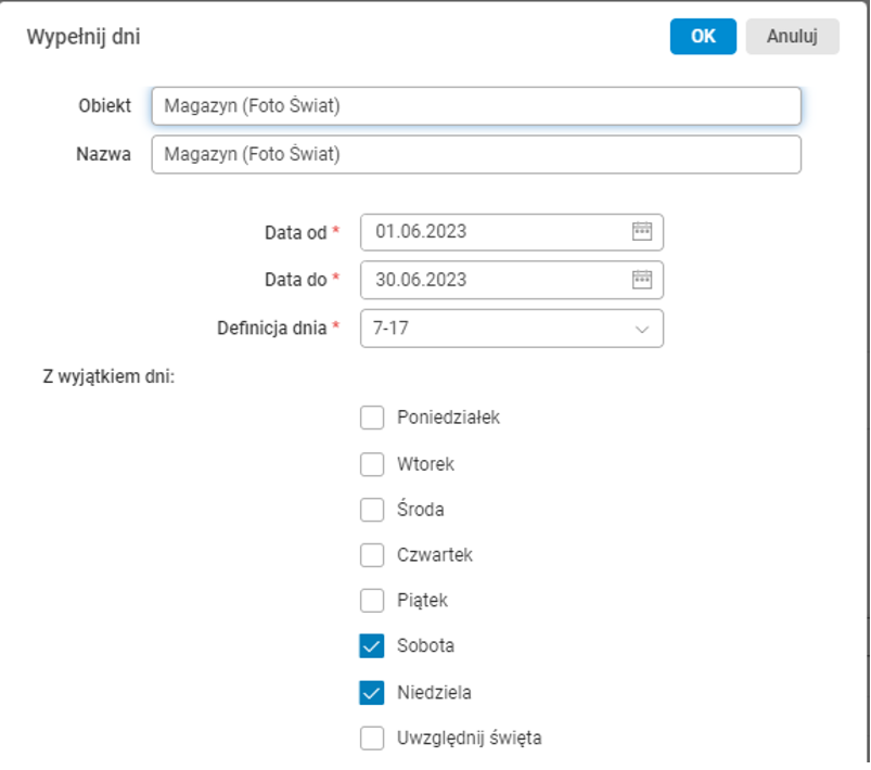 - dni niezaznaczonych (zaznaczona opcja Uzupełnij dla wszystkich niezaznaczonych dni).