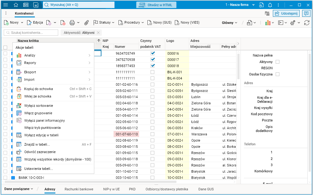 Rys. Menu Akcje tabeli z widocznymi pozycjami Kopiuj do schowka oraz Wklej ze schowka