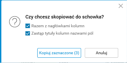 W parametrach akcji Kopiuj do schowka, czy rekordy będą kopiowane wraz z nagłówkami lub bez nich (znacznik Razem z nagłówkiem kolumn). Istnieje też możliwość zastąpienia nazw pól tytułami kolumn (znacznik Zastąp tytuły kolumn nazwami pól).