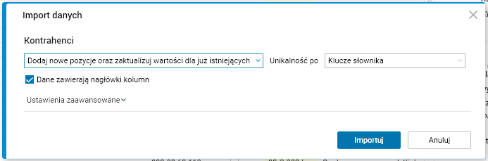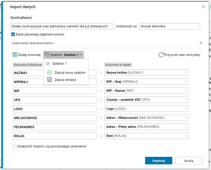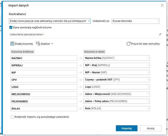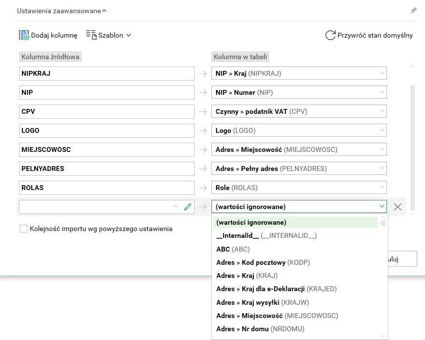 W sekcji ustawień zaawansowanych znajduje się jeszcze znacznik Kolejność importu wg powyższego szablonu wskazujący, czy kolejność importu kolumn ma się odbywać według kolumny źródłowej. Jeśli jest zaznaczony, to import odbędzie się według wskazanej kolejności w kolumnie źródłowej. Jeśli nie jest zaznaczony, to import odbywa się według kolejności pól, jaka jest w widoku słownika.