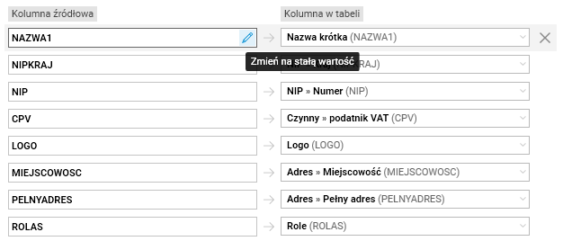 Po umieszczeniu kursora na polu kolumny źródłowej pojawia się przycisk Zmień na stałą wartość, który pozwala zamienić importowane w tym polu wartości zmienne na wskazaną wartość stałą.