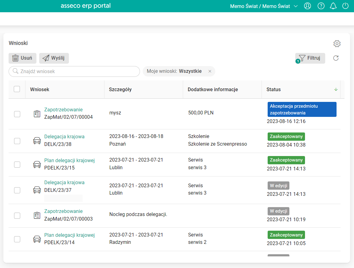 Do tej pory na pulpicie Wnioski w kolumnie Wnioski wszystkie wnioski użytkownika miały nazwę taką, jak kategoria, do której należały, czyli Delegacja krajowa/zagraniczna, Zapotrzebowanie lub Plan delegacji krajowej/zagranicznej. Dopiero po przejściu do szczegółów wniosku można było sprawdzić przypisany mu numer systemowy. Niemożliwe było również wyszukanie wniosku po jego numerze w wyszukiwarce.