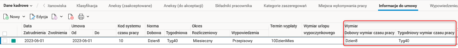 Szczegół Informacje do umowy – konfiguracja dotyczący umowy pracownika