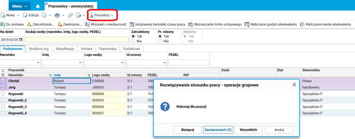 Na podstawie zdefiniowanych parametrów procedury system zarejestruje zwolnienie z pracy wybranych przez nas pracowników.