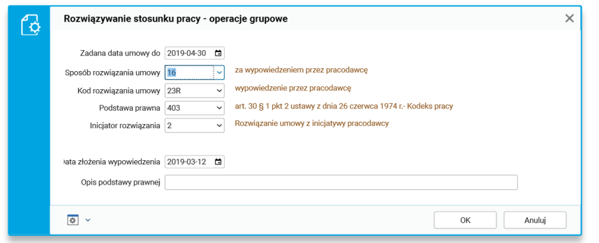Rys. 2. Parametry procedury Rozwiązywanie stosunku pracy – operacje grupowe