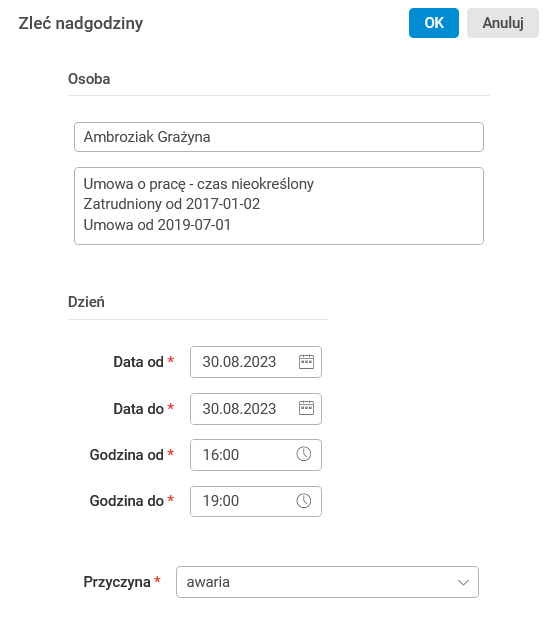 Zlecone w ten sposób nadgodziny będą widoczne w szczególe Zlecenia nadgodzin na pulpicie Harmonogramy i rozliczenia czasu pracy.