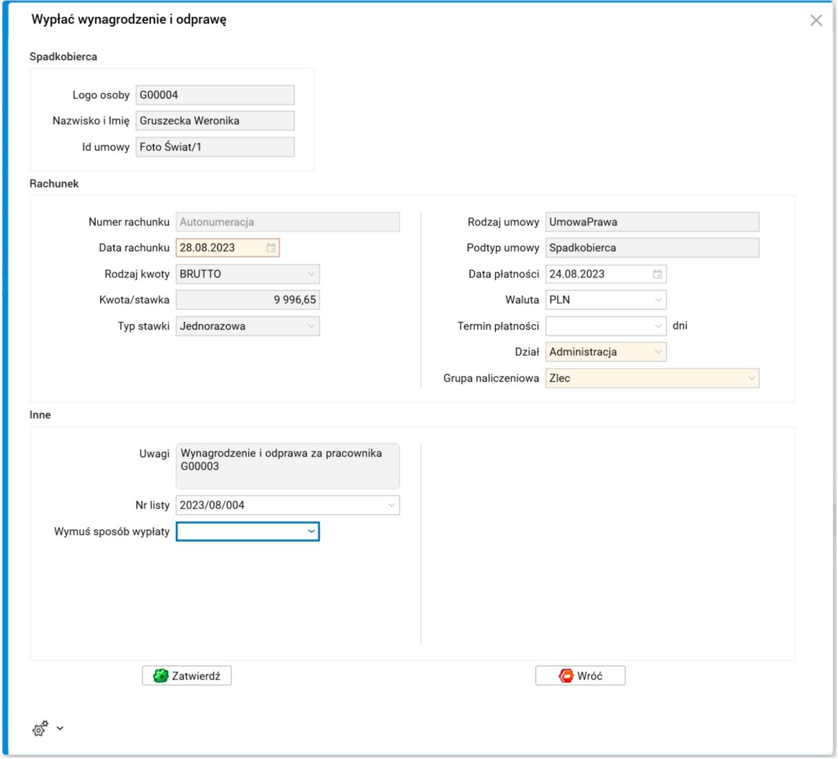 Do wypłaty wynagrodzenia, które należne było zmarłemu za przepracowany przez niego okres, a także ekwiwalentu za urlop wypoczynkowy i odprawy przysługującej rodzinie osoby zmarłej, wykorzystujemy procedurę Wypłać wynagrodzenie i odprawę. Program automatycznie wyliczy kwotę należną spadkobiercy. Należna kwota jest dzielona przez liczbę wszystkich spadkobierców przypisanych do osoby zmarłej. W przypadku gdy jest tylko jeden spadkobierca, kwota odprawy jest wypłacana w 50%.