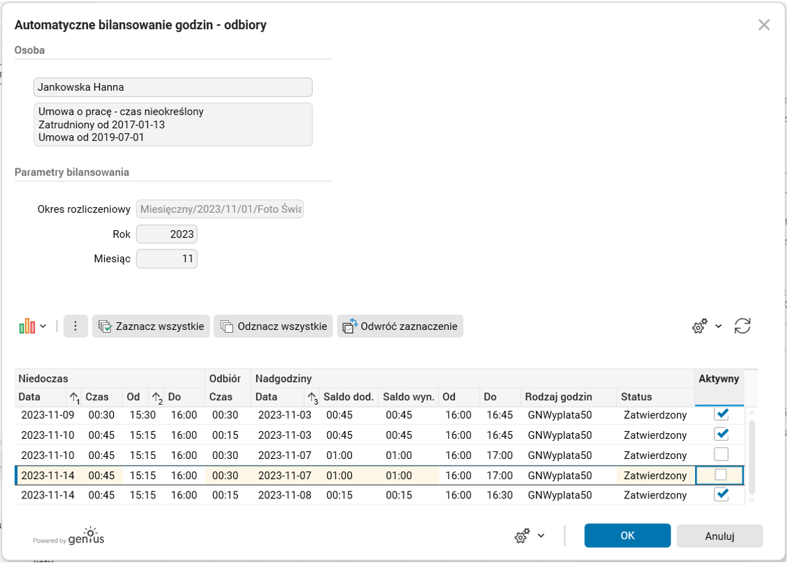 W kolumnie Aktywny użytkownik może zaznaczyć, które z proponowanych godzin mają zostać odebrane, a które nie.