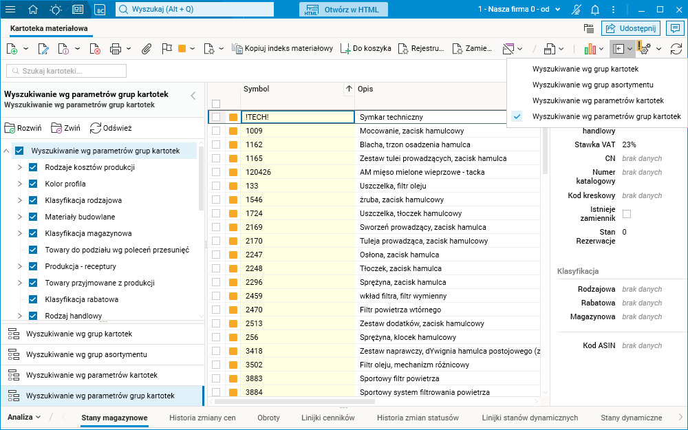 Rys. Kartoteka materiałowa, filtrowanie wg parametrów grup kartotek