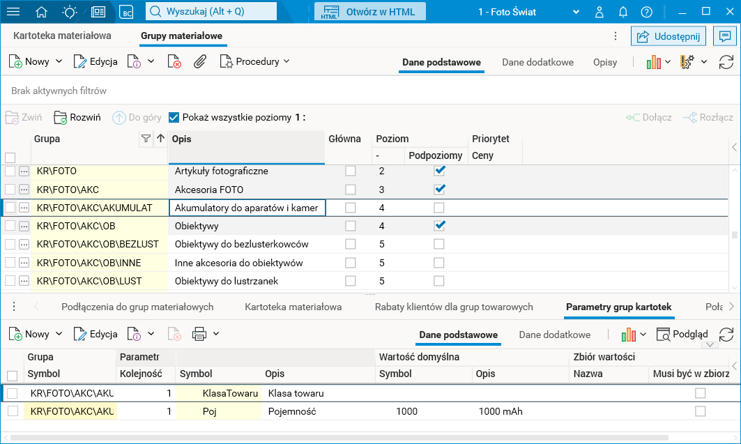 Aby widok prezentował poprawne dane należy przypisać parametry do grup kartotek. Można to zrobić w szczególe Parametry grup kartotek słownika Grupy materiałowe.