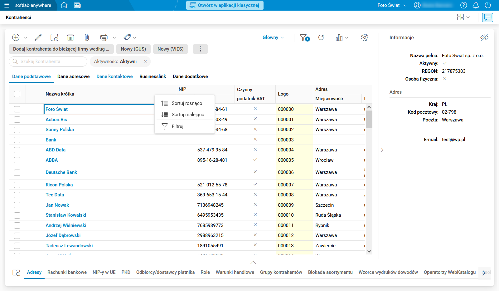 Sortowanie danych możemy uruchomić na dwa sposoby. Jeżeli klikniemy na nagłówku kolumny lewym klawiszem myszy (LPM) to wyświetli się menu dostępnych akcji sortowania i filtrowania.