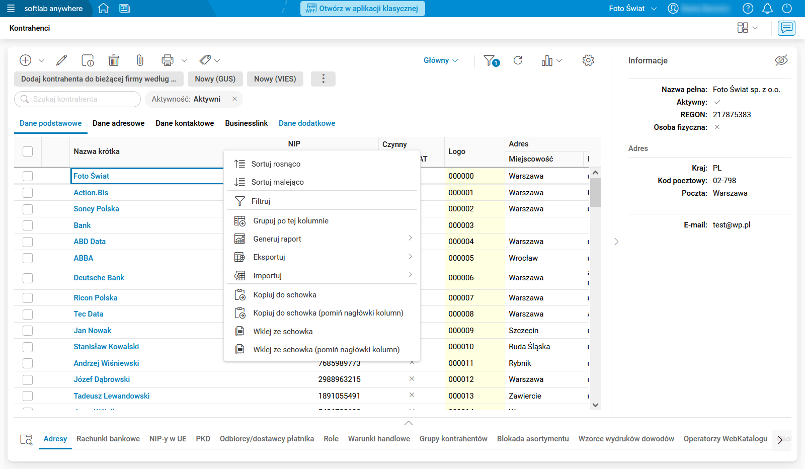 ). Dodatkowo, rozwijając menu na nagłówkach kolejnych kolumn, pojawią się dodatkowe akcje, takie jak: