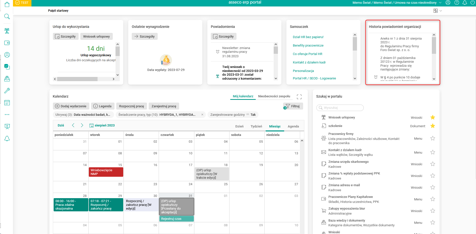 Rys. Pulpit startowy z nową sekcją Historia powiadomień organizacji
