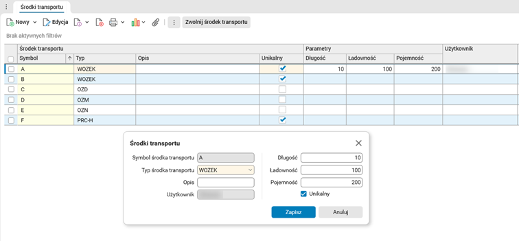 W słowniku Środki transportu zostały dodane dwa nowe pola. Pole Unikalny określa, czy dany środek transportu może być zajęty – przypisywanie dostępne jest wyłącznie dla tych środków transportu, które mają zaznaczone to pole wyboru. Pole Użytkownik zawiera login użytkownika, który aktualnie zajmuje środek transportu. W aplikacji Softlab ERP pole to jest zablokowane do edycji i pełni rolę wyłącznie informacyjną – zajęcie środka transportu może nastąpić jedynie w aplikacji WMS Client. W słowniku Środki transportu można jedynie awaryjnie zwolnić zajęty środek transportu, służy do tego nowa procedura Zwolnij środek transportu (umożliwia wyczyszczenie pola Użytkownik).
