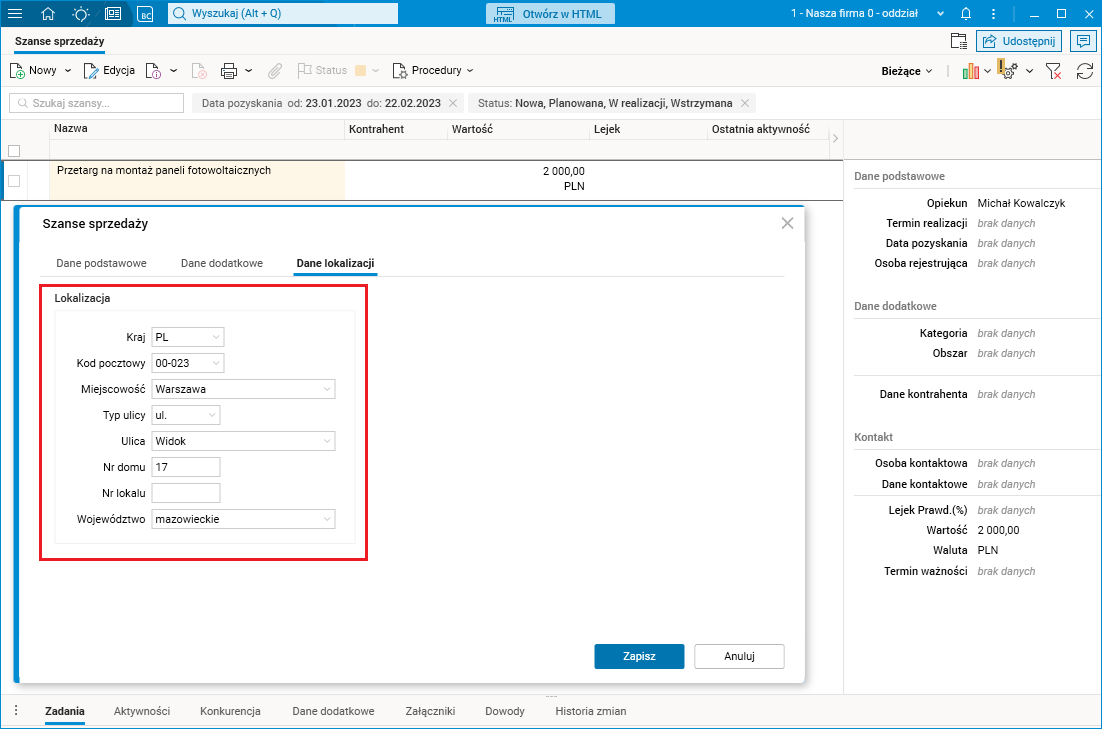 W celu wprowadzenia danych adresowych lokalizacji w słowniku Szanse sprzedaży na formularzu edycyjnym została dodana zakładka Dane lokalizacji.