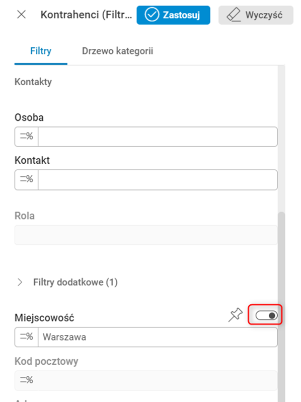 Po jej użyciu wyświetli się okno z nazwą kolumny oraz wartością pola, po której chcemy wyszukać dane. Filtrowanie uruchamiamy przyciskiem Zastosuj. Po jego użyciu dane w kolumnie zostaną odfiltrowane.