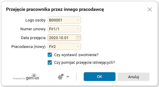 W tym celu w słowniku Pracownicy – umowy/(etaty) udostępniono nową procedurę pozwalającą na realizację procesu przejęcia pracowników na podstawie art. 23’ Kodeksu pracy.