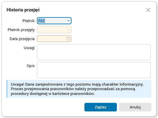 Historia przejęć, dostępna jako szczegół w słowniku Dane płatnika, spełnia jedynie funkcję informacyjną, nie jest aktywnie wykorzystywana w trakcie procesów przejmowania pracowników.
