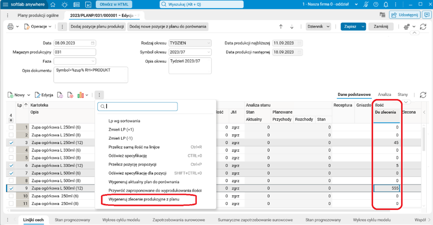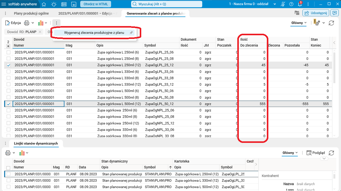 W systemie Softlab ERP ujednolicono działanie procedur do generowania zleceń produkcyjnych, dostępnych w rejestrze planów produkcyjnych i w przeglądarce do generowania zleceń. Procedury działają w ten sam sposób niezależnie od tego, czy zlecenia generowane są z rejestru planów produkcyjnych, czy też są generowane z przeglądarki linijek planów.